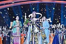 At the end of the coronation night, Suardana successfully defeated other 43 delegates from across Indonesia, being the first Balinese to win Puteri Indonesia.[27][28] She was crowned as Puteri Indonesia 2022 by the outgoing titleholder, Raden Roro Ayu Maulida Putri of East Java.[29][30] Suardana was crowned along with her fellow Puteri Indonesia queens, Cindy May McGuire and Adinda Cresheilla.[31][32]