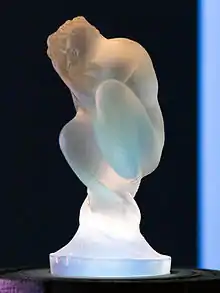 In 1905, Lalique opened a new shop at Place Vendôme which exhibited not only jewellery, but glass works as well.[2][3] It was close to the shop of renowned perfumer François Coty; in 1907, Lalique began producing ornate perfume bottles for Coty.[2][3] The production of glass objects began at his country villa in 1902, and continued there until at least 1912.[2] The first Lalique glassworks opened in 1909 in a rented facility in Combs-la-Ville, which Lalique later purchased in 1913.[2] In December 1912, Lalique hosted an exhibition of Lalique Glass—as his glass would come to be known—at the Place Vendôme shop.[2] During the First World War, the glassworks produced mundane items in support of the war effort.[2] In 1919, work began on a new production facility in Wingen-sur-Moder, which opened in 1921.[2][3] From 1925 to 1931, Lalique produced 29 models of hood ornaments; a mermaid statuette first produced in 1920 was also later sold as a hood ornament.[2] During the 1920s and 1930s, Lalique was amongst the world's most renowned glassmakers.[4]