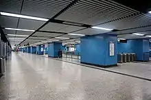 Lam Tin (Chinese: 藍田; Cantonese Yale: Làamtìn) is a station on the Hong Kong MTR Kwun Tong line built as a part of the extension to Quarry Bay. The station is linked to the nearby hillside community of Lam Tin by a series of escalators.