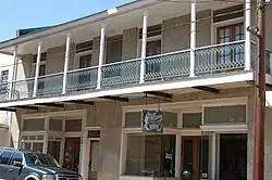 Built before the Civil War, the two-story brick commercial building features gable parapets and a wooden front gallery. The facade was stuccoed in 1922, and the structure has not been altered since then.[2]