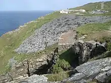 The quarry site cuts a deep "D" shape into the cliffs immediately due south of the Tintagel youth hostel building and is known as Lambshouse Cove. The near vertical cliffs around the cove are almost entirely artificial and the workihgs of drills can be seen in the rock wall.[1] The quarries are just south of Long Grass Quarry and just north of Dria Quarry.