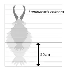 Laminacaris is a genus of extinct stem-group arthropods (Radiodonta) that lived during the Cambrian period. It is monotypic with a single species Laminacaris chimera, the fossil of which was described from the Chengjiang biota of China in 2018.[1] Around the same time, two specimens that were similar or of the same species were discovered at the Kinzers Formation in Pennsylvania, USA.[2] The first specimens from China were three frontal appendages, without the other body parts.