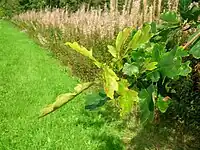 Lammas growth declines with the age of the tree, being most vigorous and noticeable in young trees. It differs in nature from spring growth which is fixed when leaves and shoots are laid down in the bud the previous year. The lammas flush involves newly made leaves.[2] One or more of the buds set in the spring on the ends of terminal and lateral stems will break, and begin to grow, producing a new shoot.[3]