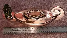 The "Lamp of Brotherhood" presently in Vancouver, British Columbia, Canada, is 31 cm long, 10.5 cm wide, and 14.5 cm high. Text on the upper surface reads: "Fraternitatis Lumen".