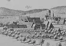 The foundation by Count Ricdag of the first religious house at Lamspringe for Augustinian canonesses is conventionally dated around 850. It was founded by a Count Riddagus, whose daughter, Richburga, became the first abbess. Lamspringe became a reformed Benedictine convent just before 1130. The convent received generous support from the bishops of Hildesheim, and became one of the wealthiest in the diocese during the 14th century.[1] The priory became Lutheran in 1571 during the Reformation, but Catholics regained it in 1629.[2] Little remains of the early medieval buildings.