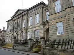 The original venue for the administration of justice in the town was Lanark Castle.[2] In the 14th century, the castle was destroyed and both judicial and municipal business moved to the tolbooth in the High Street, with prison cells on the ground floor and a courtroom on the first floor. The building, in its present incarnation, dates from 1778.[3][4] By the 1830s, the tolbooth was dilapidated and it was decided to commission new public buildings: a site was selected in Hope Street.[5] The new building was designed by Hugh Marr in the neoclassical style, built in ashlar stone and was completed in 1836.[1][6]
