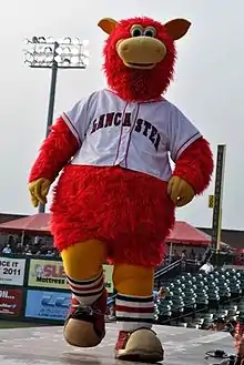 The Lancaster Barnstormers' mascot is an anthropomorphic, red cow named Cylo. He wears the team's home jersey with striped socks and retro-style sneakers. Cylo debuted on March 4, 2005, at the Mascot Roller Mill in the Lancaster County village of Mascot. His name in full is Cyloicious L. Barnstormer, alluding to Hall of Fame pitcher Cy Young and to silos, representing the county's agricultural heritage.[32] The mascot was designed by the Raymond Entertainment Group, which also produces the Phillie Phanatic's costume.
