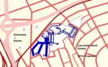 Plans were made in the 1960s to replace the substandard housing in Notting Dale. This would displace 3,000 people, who were to be accommodated in the Lancaster West Estate scheme. This was to have included an office complex and a shopping centre, but they were never built.[10] The master plan was drawn up by the architect Peter Deakins who had, a few years before, been involved in the design and construction of Golden Lane Housing by Chamberlin Powell & Bon as well as the first design stages of The Barbican also by Chamberlin Powell & Bon.[11]