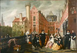 He created group and individual portraits, mainly of the members of the Stadtholder court in Leeuwarden. He also painted in Leeuwarden portraits of the local aristocracy.[8] He worked in a style close to that of Gonzales Coques and Hieronymus Janssens.[9] In Flanders, the artist also created a number of group portraits. One of the most notable ones is the signed and dated Family portrait in the courtyard of a Brussels palace (1666, Museum of the City of Brussels). This early work of the artist presents a portrait of a family as well as of a home. The composition shows 13 persons in front of a patrician residence in Brussels. In the background the Brussels Town Hall is discernible. The sitters comprise men, women and children and a mix of aristocrats and bourgeois. Five of them are holding stringed instruments (lute, viols and violins). At the centre of the group is a child who is wearing red heels, an indication that he is of royal descent.[10]