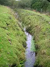 Two separate bleach works are marked on the Ordnance Survey maps and areas of open ground are indicated which would have been the bleachfields. Ample supplies of water were available from the Cadgerford Burn and the Dusk Water that run through the area. Supplies of lye made from ash tree ashes would have been plentiful in this well wooded district. In 1828 the 'Bleachfield' is recorded with two buildings in different areas that are probably the bleach works. The largest bleach works lay next to a millpond fed by the Cadgerford Burn that supplied water for both the 'bucking' process and power for the waterwheel.[13] Dye works buildings lay close by with a path marked that also ran to the other bleach works site that lay next to the Dusk Water with a wooden bridge over the watercourse.[15] By 1895 both bleach works and the dye house are shown as ruins on the OS maps[16] which links with the discovery of chlorine on the late 18th century after which Bleach works and the associated bleachfields became redundant.