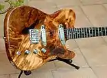 The Langcaster Guitar[4] is distinctive for its unique prehistoric swamp kauri body and intricate patterns made from the roots of the native New Zealand Kauri tree. Carbon dating carried out by the scientists at the University of Waikato in New Zealand and the University of Groningen in the Netherlands has found wood used in the guitar bodies to be more than 35,000 years old.[5] Notable players of Langcaster Guitars include Jan Akkerman,[6] Kara Gordon,[7] and Arli Liberman.