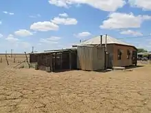 The house is constructed of corrugated iron and timber and appears to have originally consisted of a front verandah; a central hallway with three bedrooms and one lounge room; rear verandah and semi-detached kitchen. The rear verandah is now fully enclosed and the original gabled roof has been replaced by a corrugated iron hipped roof. Windows facing to the south east and north west all have metal awnings. The front verandah is enclosed using laced hoop iron.[1]