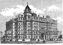 The Langham was designed by John Giles and built by Lucas Brothers between 1863 and 1865 at a cost of £300,000, equivalent to £30,515,436 in 2021.[1] It was then the largest and most modern hotel in the city, featuring a hundred water closets, thirty-six bathrooms and the first hydraulic lifts in England. The opening ceremony on 10 June 1865 was performed by the Prince of Wales. After the original company was liquidated during an economic slump, new management acquired the hotel for little more than half of its construction cost, and it soon became a commercial success.