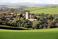 The parish church, dedicated to St Wyllow, was built in the 14th century and refashioned in the 15th. The 16th century benchends and panels from family pews have been preserved in the Victorian restoration by E. H. Sedding.[8] The church contains the brasses of Thomas de Mohun (d.1400) of Hall in Lanteglos (grandson of Reginald de Mohun and his wife Elizabeth FitzWilliams)[9] and also a monument to John Mohun (d. 1508) of Hall (great-grandson of Thomas de Mohun (d.1400)) and his wife Anne Code (d. 1508),[10] who both died within a day of each other of sweating sickness.[11]