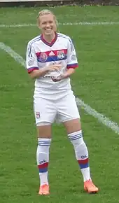During the offseasons when Dickenmann was in college, in an effort to continue playing high level soccer and still maintain her college eligibility, she starred with the New Jersey Wildcats in 2006 and in 2007, played for Jersey Sky Blue. With Jersey Sky Blue, Dickenmann was named the W-League Most Valuable Player for the 2007 W-League season.[5] Following her senior season at Ohio State, she played half a season with FC Zürich Frauen, the women's section of popular Swiss club FC Zürich helping the team win the 2008–09 league championship. Prior to graduating, it was announced that Dickenmann would be joining Division 1 Féminine club Olympique Lyonnais in 2009. Dickenmann joined the club mid-season during the 2008–09 season and was limited to only four appearances, though she did score two goals. Lyon were later declared champions of the league winning by a very wide margin. For the 2009–10 season, Dickenmann was named a starter and began the season on a positive note scoring a goal in Lyon's 6–0 win over Montigny-le-Bretonneux. On 29 November 2009, she scored her first professional hat trick in a 9–0 victory over ESOF Vendée La Roche-sur-Yon.