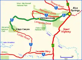 It runs in a westerly direction from Alice Springs to the community of Hermannsburg and then continues to Kings Canyon in the Watarrka National Park. After Kings Canyon, the road continues to the south to the Lasseter Highway as the Luritja Road. Its route includes a number of tourist attractions such as the Alice Springs Desert Park, West MacDonnell National Park, monuments dedicated to Aboriginal artist Albert Namatjira and Royal Flying Doctor Service founder John Flynn, as well as Albert Namatjira's house near Hermannsburg.[1]