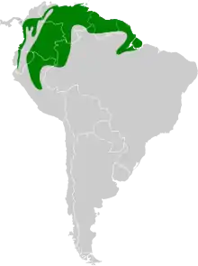 It is found in Brazil, Colombia, Ecuador, French Guiana, Guyana, Peru, Suriname, Trinidad and Tobago, and Venezuela. Its natural habitats are subtropical or tropical moist shrubland, swamps, and heavily degraded former forest.