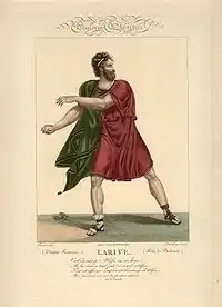 Larive made his debut at the Comédie-Française on 3 December 1770 but was not well received. He left for Brussels where D'Hannetaire engaged him for the lead rôles at the Théâtre de la Monnaie and where he spent 4 years, acting alongside Dazincourt, Grandmesnil and Florence. It was here that he got to known his future wife, Eugénie D'Hannetaire, the director's eldest daughter, whom he married in Paris on 18 June 1776 (they divorced in 1794). He was a friend of Voltaire and interpreted many of his lead roles.
