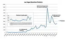 In its most recent iteration, the full marathon began on Las Vegas Boulevard heading north through the Downtown casino area, proceeded further to the northwest, turns around and finished again on the strip near the Mirage and Venetian Casinos.[8]