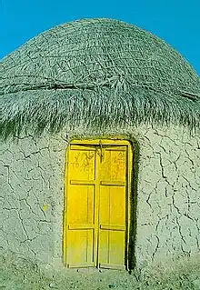 Entrance to a "toup", house of palm branches. Walls of these houses are covered with a mixture of straw and mud and their ceiling is covered by "daz" (fan palm) leaves.