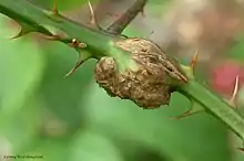 In the early summer the gall midge lays a cluster of up to forty eggs in young bramble shoots. Rapid cell growth of the tissue creates a rounded swelling of 5 x 2 cm in the stem, which sometimes has longitudinal fissures, and contains several irregular cavities with larvae. The cavities are lined with fungal mycelium on which the larvae feed. When young the larvae are white, and later in the summer and winter are orange-red. Usually the gall develops on one side of the shoot, but occasionally spreads to the other side. Initially the gall is green, but changes to reddish-brown as it matures. Larvae pupate the following spring and the adults emerge in the spring. Sometimes the gall is in a leaf petiole.[2][3]