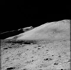 ![]() Apollo 15 panoramic camera image. The LM Falcon is visible as a dot casting a shadow to the left near the upper left corner. | |