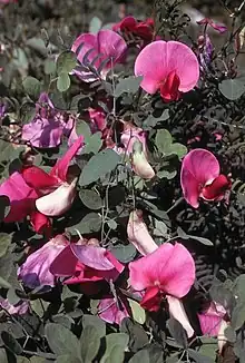 Lathyrus grandiflorus, two-flowered everlasting pea, is a species of flowering plant in the family Fabaceae, native to southern Europe. Growing to 2 m (6.6 ft) tall, it is a twining herbaceous perennial with grey-green leaves and, in late summer, bright magenta-pink flowers, the central keel a darker red. Unlike its cousin, the annual sweet pea (Lathyrus odoratus), it is unscented. Once established it is a robust plant with the ability to scramble into other shrubs and trees.[3] It is very hardy, down to −20 °C (−4 °F), so is capable of surviving conditions in most temperate regions of the world.