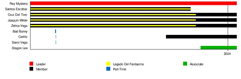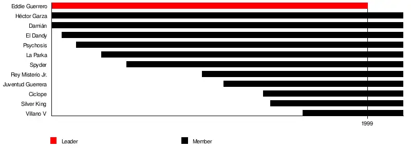 The group consisted of almost every major Mexican wrestler on the WCW roster including Psychosis, La Parka, Hector Garza, and Juventud Guerrera. Their main feud lay with Rey Misterio Jr., after he refused to join the group.[4] They also feuded with Billy Kidman, Mysterio's on-and-off American tag team partner. Mysterio was forced to become a member after losing a match to Eddie Guerrero. Chavo Guerrero Jr., Eddie's nephew, wasn't included in the stable as he was deemed "mentally unstable" by the group and rejected as a member.