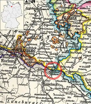 The Lauenburg-Hohnstorf Ferry (German: Trajekt Lauenburg-Hohnstorf or Lauenburg-Hohnstorfer Elb-Traject-Anstalt) was a railway ferry over the River Elbe between Hohnstorf on the left bank of the Elbe in the old Kingdom of Hanover (which became the Prussian province of Hanover in 1866) and Lauenburg in the Duchy of Lauenburg on the right bank which was then part of Denmark. From 15 March 1864 to 1 November 1878 the rail ferry linked the Lübeck–Lauenburg railway with the Lüneburg–Hohnstorf line. Both were sections of the Lübeck–Lüneburg railway.