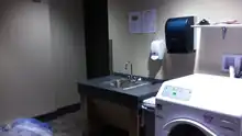A laundry room (also called a utility room) is a room where clothes are washed and dried. In a modern home, a laundry room would be equipped with an automatic washing machine and clothes dryer, and often a large basin, called a laundry tub, for hand-washing delicate articles of clothing such as sweaters, and an ironing board. A typical laundry room is located in the basement of older homes, but in many modern homes, the laundry room might be found on the main floor near the kitchen or upstairs near the bedrooms.[1]