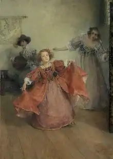 Alma-Tadema specialised in highly sentimental domestic and genre scenes of women and children, often in Dutch 17th-century settings and style, like Love's Beginning, Hush-a-bye, The Carol, At the Doorway (c.1898, shown right) and Sunshine.[6] She painted some classical subjects and landscapes akin to those of her husband, but in general her main influence was 17th-century Dutch art, which was a far less restrained influence in her work than his. She studied the works of Vermeer and de Hooch on visits to the Low Countries.[7] Alma-Tadema, like her husband, numbered her work chronologically by giving them Opus numbers.