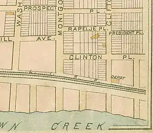 Laurel Hill station was located a few blocks west of the point where the former junction between the New York and Flushing Railroad and South Side Railroad of Long Island existed.[1] For some reason Laurel Hill did not appear on the 1894, 1897 or 1899 timetables. It was built by the LIRR in 1890. Ten years after, it was closed. And five years after that, the junction was closed for passenger service. The station was only opened for ten years and closed in 1900.[2] Industrialization of Long Island City and the altering of both street names and street patterns (in this case by the Phelps Dodge Copper Refining and Chemical Plant) have removed all traces of the former station, which is currently along 56th Road (Laurel Hill Boulevard) halfway between 43rd and 48th Streets.