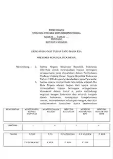 On 29 September 2021, Joko Widodo sent Presidential Letter No. R-44/Pres/09/2021 contained 2 enclosures: Bill on State Capital and Academic Draft on State Capital Relocation drafted by Ministry of National Development Planning.[12] In the official draft of the bill, the bill consisted of 9 chapters and 34 sections. The provisional chapter of the bill showed that 3 acts (Law No. 25/1956, Law No. 47/1999, and Law No. 7/2002) will be amended and 1 act (Law No. 29/2007) will be repealed after the enactment of the law if certain conditions met.