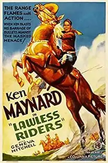 Lawless Riders is a 1935 American Western film directed by Spencer Gordon Bennet and written by Nate Gatzert. The film stars Ken Maynard, Geneva Mitchell, Harry Woods, Frank Yaconelli, Wally Wales and Slim Whitaker. The film was released on December 6, 1935, by Columbia Pictures.[1][2][3]