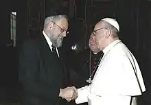 Schiffman is a member of the University's Center for Ancient Studies and Center for Near Eastern Studies. He served as president of the Association for Jewish Studies from 2000 to 2003.[6] During the academic year 1989/90 he was a fellow of the Institute for Advanced Studies of the Hebrew University of Jerusalem as part of a research group dealing with the Dead Sea Scrolls. He was a member of the academic committee for the Summer, 1997 celebration of the fiftieth anniversary of the discovery of the Dead Sea Scrolls and the 2008 60th anniversary conference, both held in Jerusalem. He is a fellow of the American Academy for Jewish Research and a corresponding fellow of the Rennert Center for Jerusalem Studies at Bar-Ilan University. He has been chairman of the Columbia University Seminar for the Study of the Hebrew Bible. He is a member of the board of the World Union for Jewish Studies and the Society for Biblical Literature where he served as chairman of the Qumran section. He is a member of the Enoch seminar and of the advisory board of Henoch.[7] He is also chairman of the International Jewish Committee on Interreligious Consultations (IJCIC) and led an IJCIC delegation for a meeting with Pope Francis at the Vatican in June 2013, according to the World Jewish Congress.[8]