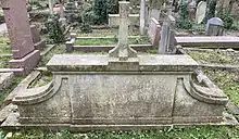 He was buried with his wife on the eastern side of Highgate Cemetery. The grave (no.44618) is almost opposite the grave of the celebrated theatre architect, Frank Matcham.