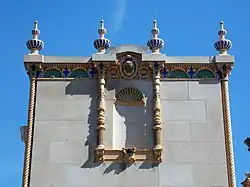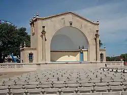 The pavilion was designed by Rudolph Clausen from the architectural firm of Clausen & Kruse. The firm also designed other historic buildings in Davenport including the Democrat Building, the Forrest Block, Scott County Savings Bank, The Linograph Company Building, and the Davenport Municipal Stadium (now known as Modern Woodmen Park).[8] The music pavilion is located just to the east of the stadium along the riverfront. The inspiration for the pavilion was Harrison Albright's Spreckels Music Pavilion (1915) that was built for the Panama–California Exposition at Balboa Park in San Diego.[4] While less decorative, it follows the same basic form and massing as the Spreckels, with flame finials, and a concentration of Baroque detail at the cornice and side openings. They differ in that the proscenium arch and the side pavilions are simpler in design.