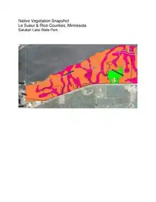 The Minnesota River flows northeastward along the west border of Le Sueur County, on its way to discharge into the Mississippi. The terrain consists of low rolling hills, dotted with lakes and ponds. The soil is rich and black.[7][9] The terrain slopes to the north and east, with its highest point near the midpoint of its east border, at 1,145 ft (349 m) ASL.[10] The county has an area of 474 square miles (1,230 km2), of which 449 square miles (1,160 km2) is land and 25 square miles (65 km2) (5.3%) is water.[11] Le Sueur is one of seven Minnesota savanna region counties where no forest soils exist and one of 17 counties where savanna soils dominate.