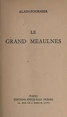 Le Grand Meaulnes (French: [lə ɡʁɑ̃ moln]) is the only novel by French author Alain-Fournier, who was killed in the first month of World War I. The novel, published in 1913, a year before the author's death, is somewhat autobiographical, especially the name of the heroine Yvonne, for whom he had a doomed infatuation in Paris. Fifteen-year-old François Seurel narrates the story of his friendship with seventeen-year-old Augustin Meaulnes as the latter searches for his lost love. Impulsive, reckless and heroic, Meaulnes embodies the romantic ideal, the search for the unobtainable, and the mysterious world between childhood and adulthood.[1]