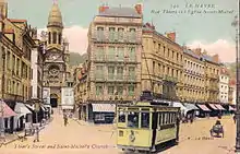 This dynamism in urban transport led to an extension of the new mode of communication, and a second route between the town hall and the neighborhood Carreau de Sainte-Adresse via the Quatre Chemins and the Broche à Rôtir was gradually handed over to cars between 1 October, 1875, and 8 May, 1879.[2] The line serving the southern part of the town between Place Louis-XVI (Gambetta) and the former Slaughterhouses began operating on 1 May, 1880.[notes 3] Meanwhile, on 2 February, 1876,[4] the Banque Française et Italienne had transferred management of the network to the Compagnie Générale Française de Tramways (C.G.F.T).