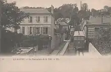 Declared to be in the public interest on 23 April, 1889,[36] and opened for service on 17 August, 1890,[36] this 343 m-long railroad, 145 m of which was viaduct track, was served by 2 cars with 48 seats, making the journey in 3 minutes.[37] In 1911, in view of the company's popular (600,000 passengers a year) and financial success,[37] it was decided to replace steam traction with electric traction. The inter-war period confirmed this success, with over 2 million passengers being transported annually in higher-capacity cars.[36] Indispensable to the local population, from 25 July, 1945 the funicular was operated directly by the town,[38] which decided to modernize it at the end of the 1960s. After extensive work between 1968 and 1972, a modern funicular was made available to the people of Le Havre.[39] New two -wheelset cars with pneumatic tires running in U-shaped[36] sections were put back into service, much to the delight of schoolchildren, the main users of this mode of transport, so rare in the north of the country. In 2021, Le Havre's funicular was completely renovated and rebuilt.