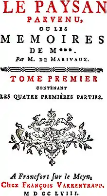 Le Paysan parvenu is an unfinished novel by Pierre de Marivaux. Five parts by Marivaux appeared from May 1734 to April 1735,[1] and an ending was added by another writer. The work is supposedly the original for subsequent tales of poor boys of a heroic nature who have "made good". The change in style is noticeable from Marivaux's literary style to the more racy conclusion written by the other author.