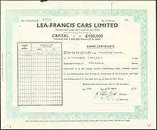 Share of the Lea-Francis Cars Ltd., issued 30. September 1961