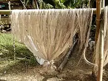 Leaf fibers or hard fibers are a type of plant fiber mainly used for cordage (producing rope). They are the toughest of the plant fibers which is most likely due to their increased lignin content when compared to the other groups of plant fibers.[1] They are typically characterized as being very tough and rigid lending them towards being used in rope production over clothing or paper like other plant fibers.[2]