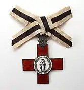 The original badge of the order, awarded from 1899, was a red enamelled silver gilt cross surmounted by the plumes of the Prince of Wales and with a central roundel bearing the crest of the League, an image of ‘Charity’.[7] The reverse is plain, save for the inscription “League of Mercy 1898” on the central roundel. It was awarded for at least five years distinguished and unpaid personal service to the League in support of charity hospitals, or in the relief of suffering, poverty or distress. A bar for a second award was introduced in 1917.[8] The Order ceased to be awarded after 1946, and the League itself closed in 1947.[2]