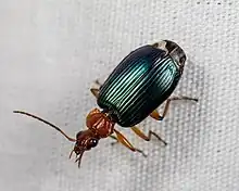 Lebia grandis is the largest species in its genus found in North America. It is about one centimetre long with a rusty orange head, thorax and legs, a black abdomen and an iridescent blue or purple lustre to the dark coloured elytra.[2] These are wide but rather shorter than the abdomen which protrudes posteriorly.[3]