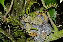 Lecanopteris carnosa is a species of tropical fern in the genus Lecanopteris native to Borneo, Malaysia, the Philippines, Sumatra, and Sulawesi.[1][2] An epiphyte, its thick, fleshy rhizome forms hollow spaces that act shelter for ants,[3] making this a myrmecophyte, similar to others in this genus.[4]