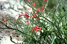 Lechenaultia hirsuta, commonly known as hairy leschenaultia,[2] is a species of flowering plant in the family Goodeniaceae and is endemic to the west of Western Australia. It is a straggling, low-lying shrub with few branches, fleshy leaves, and scarlet flowers.