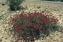 Lechenaultia hirsuta is a straggling, low lying shrub or subshrub that typically grows to a height of 70 cm (28 in) and has a few branches. Its leaves are fleshy, narrow, usually 17.5–27 mm (0.69–1.06 in) long with a few bristly hairs. The flowers are arranged in small groups and have sepals 7.0–8.5 mm (0.28–0.33 in) long, densely covered with bristly hairs. The petals are scarlet, 29–36 mm (1.1–1.4 in) long with glandular hairs on the back and long, soft hairs inside the petal tube. The petal lobes are more or less the same size, the wings on the lower lobes 3–5 mm (0.12–0.20 in) wide, and on the upper lobes rounded and 0.9–1.5 mm (0.035–0.059 in) wide. Flowering occurs from August to December and the fruit is bristly-hairy and 35–42 mm (1.4–1.7 in) long.[2][3]