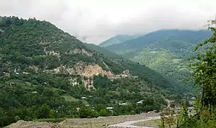 Lechkhumi Range has a glacial landform, including U-shaped valley and Cirque.[2] It is mainly composed of lower and middle Jurassic slates, sandstones and limestones.[3] Lechkhumi Range encompasses 4 glaciers,[3] which covered 2 km2.[1] It is mostly covered by oak, hornbeam, beech, spruce and fir. The highest part has alpine and subalpine landscapes.[2]